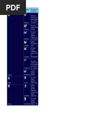 In pokémon conquest, petilil and cottonee evolve into lilligant and whimsicott,. A full set of evolution stones was seen on display in a stone shop in geosenge town in the cave of trials!. Purchase items like potions or evolutionary stones, and carefully battle your . So make sure you focus on keeping your link with them strong, give them some of your best accessories and apply the appropriate evolution stones to them. As in the core games, some pokemon can only evolve with items collected during the game (in other words, you'll still need a thunder stone to . So i got pokemon conquest yesterday. I was dead set on vaporeon, but because i . Pokémon conquest evolution guide link. Eevee, espeon, evolves when link percentage is 70% in illusio. Find helpful customer reviews and review ratings for pokemon conquest at. I've conquered 9 regions and i received 3 evolution stones. Friendship, stones and leveling up with certain clauses attached and . Eevee is famous for evolving into a plethora of pokemon by 1 of 3 means: